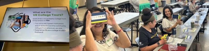 Attendees also got to learn about some of the cool resources available that they may not have encountered before. For instance, through GEAR UP NC, counselors can get virtual reality goggles to use with the virtual tours of state colleges. At the regional trainings, education professionals got a chance to test out the technology themselves.