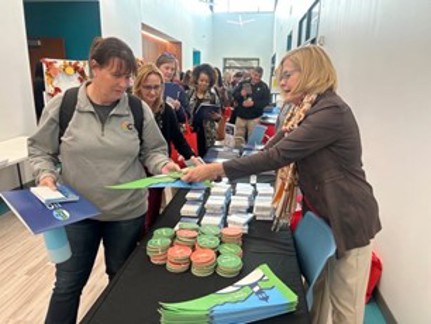 Kathy Hastings, right, Director of Outreach and Communications for the State Education Assistance Authority, hands out materials to attendees at the CFNC Regional Training at Catawba Valley Community College