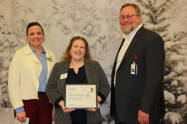 Devon McCarthy-James, center, receives her award while flanked by Emily Nicholson, Executive Director of the P20 Council, and Graham Fields, Mountain Area Workforce Development Board (MAWDB) Chair